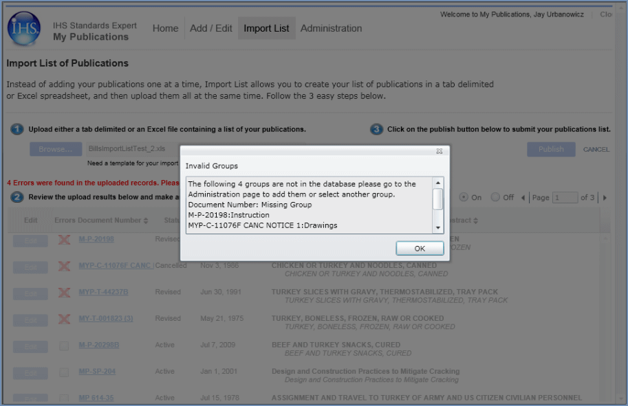 In this example, you are advised to add the missing groups on the Administration page or enter a different valid group to your import list. Before making corrections to the documents marked with a red X, enter the missing group names into My Publications on the Administration page. (See Adding, editing, and removing groups.) Then, corrections must be made to your import list prior to publishing.
